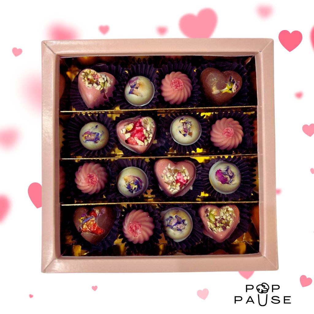 Our POP PAUSE popcorn pralines combine premium Belgian chocolate, crispy homemade popcorn and carefully selected ingredients. Each gift box contains a unique mix of flavors and colors that delight chocolate lovers and anyone looking for an original gourmet treat.