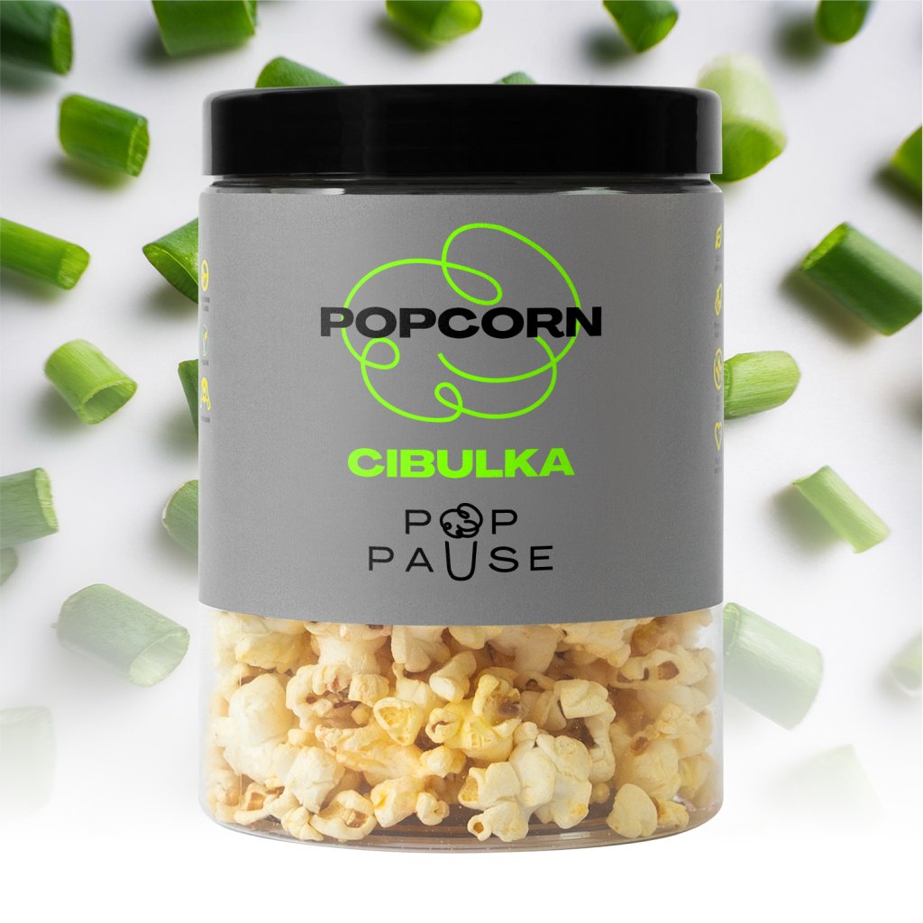 Savory popcorn with spring onion flavor. Crispy POP PAUSE popcorn with a light and fresh taste, perfect for movie nights or parties.